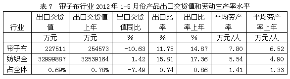 從行業(yè)產(chǎn)品出口交貨值和勞動(dòng)生產(chǎn)率水平看,2012年1-5月份簾子布行業(yè)產(chǎn)品出口交貨值為22.75億元,占紡織全行業(yè)的0.69%;出口交貨值比上年同期減少10.63%;該行業(yè)產(chǎn)品出口比率(出口交貨值/工業(yè)銷(xiāo)售產(chǎn)值)為11.75%,而上年同期為14.87%,表明該行業(yè)產(chǎn)品出口狀況較好;從勞動(dòng)生產(chǎn)率的水平看,2012年1-5月份簾子布行業(yè)平均勞產(chǎn)率(工業(yè)增加值/從業(yè)人數(shù))為7.80萬(wàn)元/人,而上年同期為6.52萬(wàn)元/人,表明該行業(yè)勞動(dòng)生產(chǎn)率的實(shí)際水平比較理想。