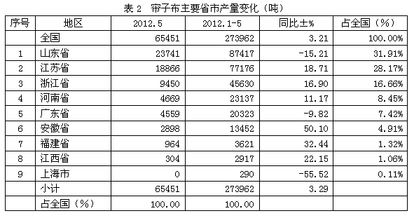 全國(guó)簾子布2012年1-5月份產(chǎn)量合計(jì)為27.40萬(wàn)噸,比上年同期增加3.21%;其中產(chǎn)量最大的省市是山東省,產(chǎn)量為8.74萬(wàn)噸,為省市龍頭;其次是江蘇省,產(chǎn)量7.72萬(wàn)噸,位居亞軍;然后是浙江省,產(chǎn)量4.56萬(wàn)噸,榮立第三;河南省2.31萬(wàn)噸,為第四;廣東省2.03萬(wàn)噸,占第五;安徽省1.35萬(wàn)噸,位居第六;接下來(lái)是福建省0.36萬(wàn)噸,為第七;江西省0.29萬(wàn)噸,占第八;上海市0.03萬(wàn)噸,位居第九;上述9大省市2012年1-5月份產(chǎn)量合計(jì)為27.40萬(wàn)噸,占全國(guó)2012年1-5月份總產(chǎn)量的100.00%。