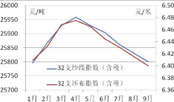 數(shù)據(jù):2013年三季度,國內(nèi)32支純棉普梳紗線、32支純棉坯布的價格延續(xù)了二季度以來小幅下滑的趨勢,三季度均價分別為25831元/噸和6.42元/米,較二季度相比分別下降了0.38%和0.71%。