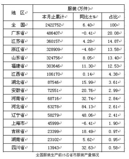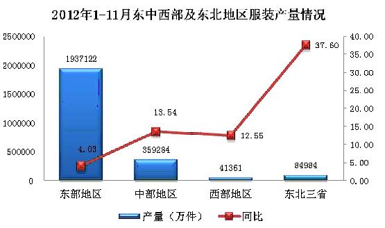 2012年,中國服裝行業(yè)受到外需不振、內(nèi)需增長趨緩、生產(chǎn)要素成本持續(xù)上升等因素影響,進(jìn)入調(diào)整轉(zhuǎn)型期,增速放緩,企業(yè)面臨緊迫壓力。但是,全行業(yè)通過努力,依然實(shí)現(xiàn)出口、內(nèi)銷、生產(chǎn)、效益等主要指標(biāo)的增長。 生產(chǎn):總產(chǎn)量與2011年基本持平 2012年1~12月,規(guī)模以上企業(yè)(簡稱:規(guī)上企業(yè))產(chǎn)量增速放緩,規(guī)模以下企業(yè)(簡稱:規(guī)下企業(yè))產(chǎn)量有所減少,服裝總產(chǎn)量與2011年基本持平。東部地區(qū)增速較慢,中西部地區(qū)增速較快,東北三省快速增長,產(chǎn)業(yè)呈現(xiàn)出由東部逐漸向其他地區(qū)轉(zhuǎn)移的趨勢。 產(chǎn)量與2011年基本持平 根據(jù)國家統(tǒng)計局?jǐn)?shù)據(jù)顯示,2012年1~12月規(guī)模以上企業(yè)累計完成服裝產(chǎn)量267.28億件,同比增長6.20%。其中梭織服裝135.10億件,針織服裝132.19億件,分別比2011年同期增長7.73%和4.68%,產(chǎn)量增速漸緩。 同時,根據(jù)中國服裝協(xié)會跟蹤調(diào)研的15個重點(diǎn)服裝產(chǎn)業(yè)集群數(shù)據(jù)顯示,關(guān)停以及減產(chǎn)的規(guī)模以下企業(yè)數(shù)量不低于10%,產(chǎn)量有所減少。 綜觀全行業(yè),2012年服裝總產(chǎn)量與2011年基本持平。