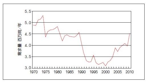 從全球需求來看,2010年世界溶解漿需求量恢復增長,達到1990年危機前的450萬噸。此前溶解漿需求量在1975年最高,達到530萬噸,隨后近30年,需求持續(xù)下降,到20世紀90年代初,隨著東歐社會劇變出現(xiàn)劇烈萎縮,2000年需求量320萬噸,為最低水平,而2000~2010年,需求又呈快速上漲趨勢。