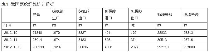 與上月相比,氨綸纖維行業(yè)2012年11月份產(chǎn)量和進(jìn)出口有所波動(dòng),從而使得當(dāng)月新增資源和凈增資源均有所變化。