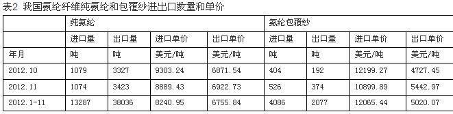從我國(guó)氨綸纖維不同品種的進(jìn)出口情況看,2012年1-11月份氨綸纖維純氨綸進(jìn)口1.33萬(wàn)噸,進(jìn)口單價(jià)8240.95美元/噸;出口3.80萬(wàn)噸,出口單價(jià)6755.84美元/噸;氨綸包覆紗進(jìn)口0.41萬(wàn)噸,進(jìn)口單價(jià)12065.44美元/噸;出口0.21萬(wàn)噸,出口單價(jià)5020.07美元/噸;表明我國(guó)氨綸纖維純氨綸和氨綸包覆紗進(jìn)出口狀況良好。