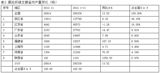 從2012年11月份的情況看,全國(guó)氨綸當(dāng)月總產(chǎn)量為2.89萬(wàn)噸,上述8大省市的當(dāng)月產(chǎn)量合計(jì)為2.89萬(wàn)噸,占全國(guó)當(dāng)月總產(chǎn)量的100.00%;由此可見(jiàn),我國(guó)前8大省市的氨綸產(chǎn)量約占全國(guó)總產(chǎn)量的全部。
