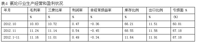 從企業(yè)生產(chǎn)經(jīng)營(yíng)和盈利狀況看,氨綸行業(yè)毛利率2012年1-11月份為11.16%,三費(fèi)比率(營(yíng)業(yè)、管理和財(cái)務(wù)費(fèi)用率之和)為11.01%,利潤(rùn)率為0.49%,如果剔除非經(jīng)常性損益的影響,名義稅前利潤(rùn)率為0.15%;該行業(yè)庫(kù)存比率為11.64%,表明產(chǎn)品銷(xiāo)售正常;出口比例為11.91%,表明出口狀況較好;該行業(yè)虧損面為67.18%。由此可見(jiàn),在氨綸行業(yè)中,生產(chǎn)經(jīng)營(yíng)狀況運(yùn)作得一般。