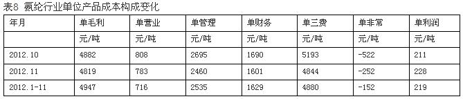 從單位產(chǎn)品成本構(gòu)成變化情況看,2012年1-11月份我國(guó)氨綸行業(yè)中相對(duì)于每噸氨綸產(chǎn)量而言,其單毛利為4947元/噸,單營(yíng)業(yè)(單位產(chǎn)品的營(yíng)業(yè)費(fèi)用)為716元/噸,單管理(單位產(chǎn)品的管理費(fèi)用)為2535元/噸,單財(cái)務(wù)(單位產(chǎn)品的財(cái)務(wù)費(fèi)用)為1629元/噸,單三費(fèi)為4880元/噸,單非常(單位產(chǎn)品的非經(jīng)常性損益)為-152元/噸,單利潤(rùn)(稅前利潤(rùn))為219元/噸,如果剔除非經(jīng)常性損益的影響,單位產(chǎn)品的名義稅前利潤(rùn)為67元/噸。