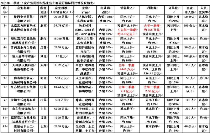 行業(yè)一季度各項數(shù)據(jù)還未最終出爐,但個別先行指標已經(jīng)表明,整個行業(yè)的一季度運營情況與去年同期基本持平。按照應用領域劃分,出口比重較大的醫(yī)用衛(wèi)生材料,去年出口成績就不理想,今年依舊維持弱勢。而由于國家近年來加大了對鐵路、公路、機場、水利、環(huán)保等重大基礎設施建設的投資力度和政策扶持力度,土工材料、過濾材料、再生纖維回收領域的市場反饋相對良好。因循這一宏觀導向,我們對去年參與本刊季度市場調查的企業(yè)進行了回訪,同時擴大了對以上這些應用領域的企業(yè)采樣。 在提供業(yè)績數(shù)據(jù)的12家企業(yè)中,除了2家企業(yè)訂單下降或持平,其余均表示一季度訂單量有不同程度上升。眾所周知,產(chǎn)業(yè)用紡織品企業(yè)很少拿到中長期訂單,而短期訂單的弊端就在于規(guī)劃性較弱,不僅對于上游原材料采購如此,對于未來市場布局和贏利預期亦是如此。而我們欣喜地發(fā)現(xiàn),無論訂單是否飽滿,企業(yè)都不再坐享其成,大企業(yè)深刻反省研發(fā)投入和人才結構與世界頂尖企業(yè)的差距,在坐穩(wěn)內銷江山的同時重新制定海外市場拓展目標;中小型企業(yè)則在把握手中訂單的同時積極思考:如何借助多種營銷模式打通下游壁壘、如何為用戶提出建設性意見、如何讓產(chǎn)品真正做到價廉物美。 大、中、小型企業(yè)把握好各自的命運固然重要,但各自為政的結果必然使中國企業(yè)在面對更強大的競爭對手時呈現(xiàn)產(chǎn)業(yè)鏈紛爭。拿政策扶持來講,不少企業(yè)認為所謂的高關注度和高曝光率其實是有利有弊,利在發(fā)展?jié)摿Ρ厝粠硗顿Y力度加大,弊則在于同時帶來的上游加壓苦不堪言,同時還要繼續(xù)面對下游識別體系不健全。大、中、小型企業(yè)構建利益共同體的思路依舊在萌芽狀態(tài),“責任先行”還是“利益先行”的問題有待厘清。 預期樂觀派 1.陜西金蘭貿易有限公司 2.北京東方雨虹防水技術股份有限公司 3.浙江嘉興弘揚無紡新材料有限公司 4.天津膜天膜科技股份有限公司 5.恒天嘉華非織造有限公司 6.蘇洲嘉業(yè)再生資源有限公司 風險防患派 7.廊坊中紡新元無紡材料有限公司 8.江蘇悅達紡織集團有限公司 9.無錫天樂濾料科技有限公司 10.山東華業(yè)無紡布有限公司 11.福建晉江寶元非織造材料有限公司 12.泰安長豐土工材料有限公司 陜西金蘭:“傳統(tǒng)模式+網(wǎng)絡營銷”重構推廣策略 除了保持現(xiàn)有的銷售方式,公司今年還特意增加了網(wǎng)上銷售模式。此外,公司還加大了研發(fā)方面的投入,準備在今年年內推出防靜電羊毛衫。 受訪人:梁甜(辦公室文員) 隨著紡織行業(yè)整體形勢回暖,公司今年的業(yè)務量也隨之大大增加,一季度銷售額較去年同期增長15%左右。由于訂單數(shù)量激增,車間出現(xiàn)了員工數(shù)量不夠的現(xiàn)象,公司目前希望可以盡快招聘到技術熟練的員工。 今年1月份,公司成立了專門的客服中心,幫助客戶解決售后問題,并開始推行每周例會的制度。例會要求所有員工必須參加,目的是要員工積極發(fā)言,提出自己的觀點,充分調動員工的積極性。 除了保持現(xiàn)有的銷售方式,公司今年還特意增加了網(wǎng)上銷售的模式,并決心加大企業(yè)宣傳力度。此外,公司還增加了研發(fā)方面的投入,積極拓展新領域,除了做好安全防護服,還將在今年推出防靜電羊毛衫。目前,公司正在積極籌備競標“長慶石化員工安全防護服”項目,如果能夠成功,那么公司的效益將實現(xiàn)翻番。 東方雨虹:《建筑防水行業(yè)準入條件》遏制無序競爭 今年2月國家工業(yè)和信息化部頒布了《建筑防水行業(yè)準入條件》,該政策的實施有助于提升行業(yè)準入門檻,遏制無序競爭。 受訪人:劉斌(總經(jīng)理) 從一季度銷售市場分布來看,公司參與政府工程項目(高鐵、地鐵等)約占市場總額40%,銷售收入較去年同期持續(xù)穩(wěn)定增長,預計今年底可實現(xiàn)8000萬平方米防水卷材的生產(chǎn)能力。今年2月國家工業(yè)和信息化部頒布了《建筑防水行業(yè)準入條件》,公司按照相關要求向北京市相關主管部門申報行業(yè)準入,同時公司生產(chǎn)過程的排放均經(jīng)過環(huán)保部門的驗收達標。該政策的實施有助于提升行業(yè)準入門檻,遏制無序競爭。 今年8月份公司將在廣東惠州生產(chǎn)基地以及江蘇徐州生產(chǎn)基地分別新增1000萬平方米防水卷材和2萬噸防水涂料的生產(chǎn)能力,進一步擴大市場占有率。雖然公司目前在國內已經(jīng)具有穩(wěn)定的市場地位,但在海外市場的占比還是較低,近期籌劃設立國際貿易部與國際工程部,力求在海外市場取得的持續(xù)穩(wěn)定發(fā)展。 弘揚無紡:“短期訂單”也能實現(xiàn)放長線釣大魚 公司一方面配備先進的質量檢測設備,另一方面擴大研發(fā)人員隊伍,目前從事技術研發(fā)的人員占公司職工總數(shù)20%左右。 受訪人:許菲(銷售人員) 企業(yè)近期的訂單量較去年同期有小幅上漲,效益也開始逐步回升。非織造布企業(yè)的業(yè)務屬于“短期訂單”,即從收到訂單到完成訂單的時間不會太長,通常不存在提前預約訂單的情況,因此不方便直接預測公司下半年的情況,但按照目前的情形來看應該是呈上升趨勢。 在目前的競爭形勢下,企