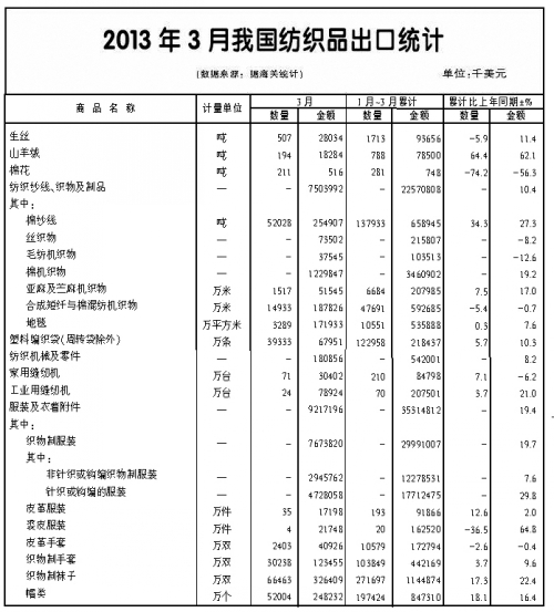 一季度紡織品服裝出口實現(xiàn)增長的原因主要有4個方面:首先,主要市場需求略為回暖,低基數(shù)、“補庫存”推動紡織服裝類消費品出口實現(xiàn)較快增長。2013年年初,美國經(jīng)濟出現(xiàn)緩慢復蘇跡象,歐盟經(jīng)濟逐步脫離底部,形成向上拐點,新興經(jīng)濟體經(jīng)濟保持增長。外部需求回暖對出口形成最直接的影響:零售商開始大量進貨,補充去年放空的庫存,也因此帶動了我國服裝、紡織品、箱包等7大類勞動密集型產品合計出口970億美元,增長21.8%。