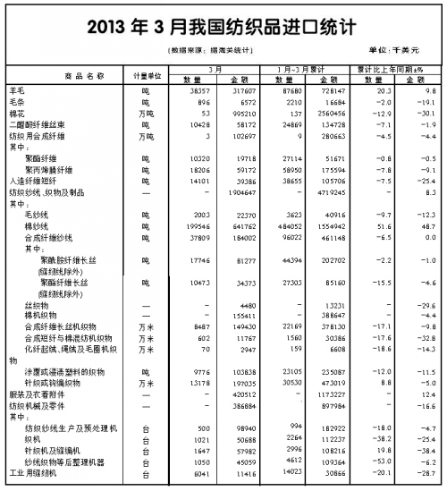 一季度,紡織原料進口數(shù)量和價格雙跌。進口量179萬噸,下降9.9%,其中棉花進口136.5萬噸,下降12.9%;化纖進口17萬噸,下降7%。原料進口平均單價下降12.8%,其中棉花進口單價延續(xù)了2012年的跌勢,一季度均價已不足2000美元/噸,降幅近20%;化纖進口單價下跌2.4%。3月底,2012年度棉花臨時收儲結束,加之部分滑準稅配額發(fā)放,使當月棉花進口數(shù)量環(huán)比反彈,平均價格較2月略有回升。國內市場現(xiàn)貨價格穩(wěn)中略漲,月均價19356元/噸,環(huán)比上漲0.4%。國際棉價(進口棉價格指數(shù))在1%關稅和滑準稅下折人民幣分別為15501元/噸和16131元/噸,與同期中國棉花價格指數(shù)的差價分別縮小至3855元和3225元。