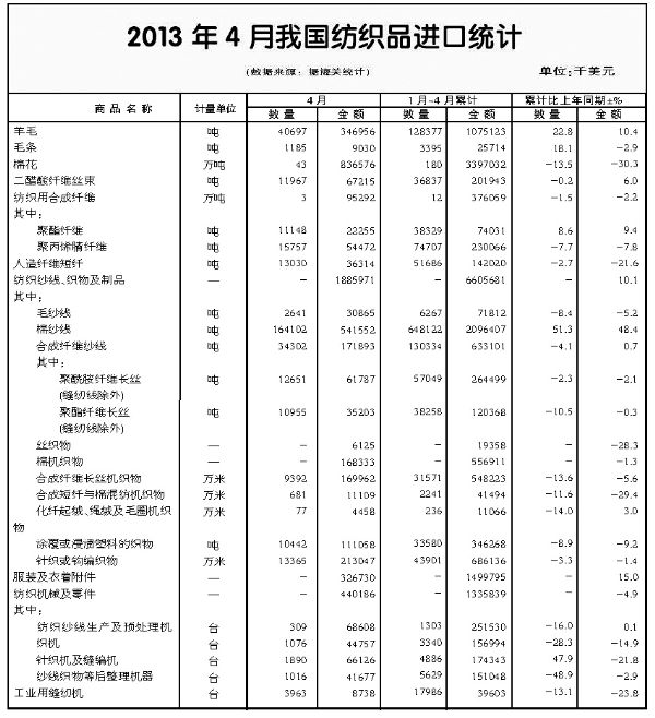 2013年1-4月全國紡織品服裝進(jìn)出口形勢概述