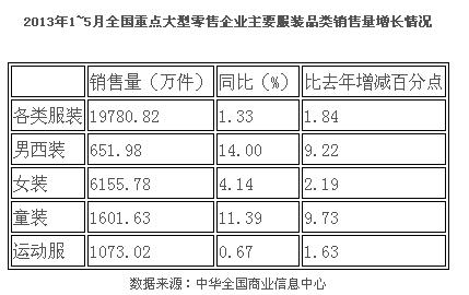 三、按品類分析:男西裝童裝增幅較大。根據(jù)中華全國商業(yè)信息中心統(tǒng)計,2013年1~5月份,全國重點大型零售企業(yè)銷售各類服裝1.98億件,同比小幅增長1.33%,但其中男西裝和童裝增幅相對較大,增速分別比去年同期提高9.22和9.73個百分點。