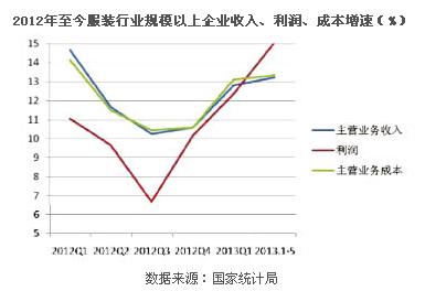 服裝行業(yè)規(guī)模以上企業(yè)盈利水平基本平穩(wěn)。據(jù)國家統(tǒng)計局數(shù)據(jù),2013年1~5月,我國規(guī)模以上服裝企業(yè)主營業(yè)務(wù)收入和利潤總額分別增長13.23%和15.05%,增速較2012年同期分別提高1.32和4.92個百分點?! ?/p>
