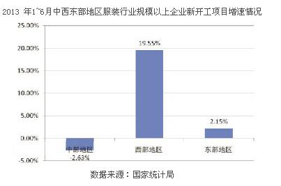 與去年同期相比,2013年1~6月,西部地區(qū)規(guī)模以上服裝企業(yè)新工開項目數(shù)量增速高于中部和東部地區(qū),顯示行業(yè)投資區(qū)域結(jié)構(gòu)繼續(xù)調(diào)整,更多投資向西部地區(qū)集中。