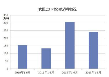 從產(chǎn)品類別看,上半年我國累計進口棉花241萬噸,同比下降21%,棉花進口額為46.8億美元,同比下降35%。從單價變化上看,今年上半年棉花進口單價要低于去年同期。進口數(shù)量同比表現(xiàn)為負增長,一方面原因是2012年進口棉花數(shù)量基數(shù)大,其次是因為一些紡織企業(yè)每月拿到的配額數(shù)量較小,可能會集中使用。今年首次實施配額與儲備棉購買量掛鉤的政策,從今年7月以前拍儲進度來看,25%左右的國儲棉成交率也導致了配額發(fā)放進度緩慢,從總量上看,截至7月底,2013年發(fā)放的配額數(shù)量要少于2012年。