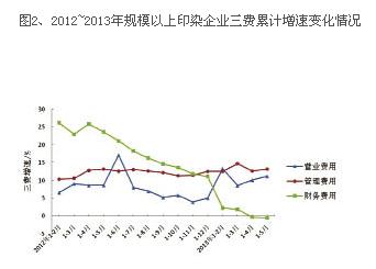 2011~2013年,財務費用增速一直保持下降趨勢,管理費用增速基本持平。今年1~5月份規(guī)模以上印染企業(yè)財務費用同比減少0.57%,達到近三年最低點,增速較2012年同期下降24.23個百分點;管理費用同比增長13.24%,與去年同期增速持平;營業(yè)費用同比增長11.17%,增速較去年同期下降2.52個百分點,三費增速的下降表明印染企業(yè)管理水平不斷提高。