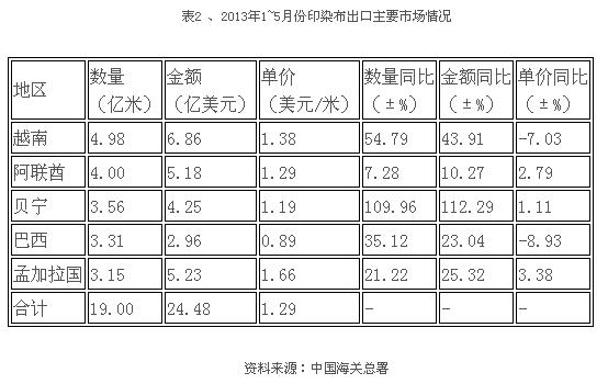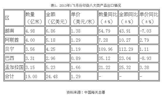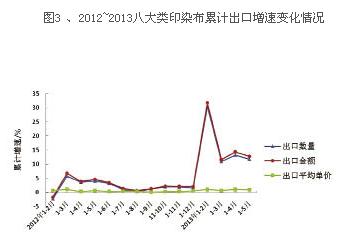 今年1~5月,印染八大類產(chǎn)品出口數(shù)量72.28億米,同比增加11.77%,增速較去年同期上升7.76個百分點;出口金額84.58億美元,同比增加12.84%,增速較去年同期上升8.19個百分點;出口平均單價1.17美元/米,同比增長0.96%,增速較去年同期上升0.34個百分點。2009~2012年,印染八大類產(chǎn)品出口數(shù)量和金額4月份后保持平穩(wěn),2013年2月份開始出口數(shù)量和金額保持逐月增長態(tài)勢,預測今年下半年出口數(shù)量和金額將處于平穩(wěn)增長狀態(tài),且增速高于2012年?! ?/p>