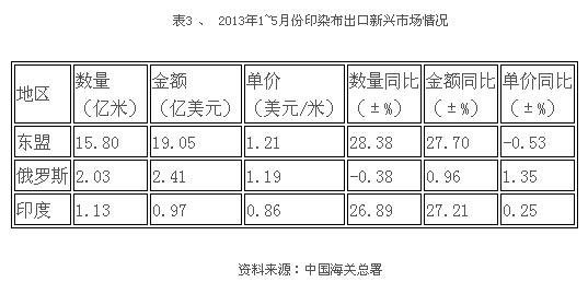 主要出口市場情況。印染八大類出口數(shù)量前五市場分別為越南、阿聯(lián)酋、貝寧、巴西和孟加拉國,五市場占出口金額的28.94%。五市場中,對貝寧出口大幅增長,出口數(shù)量和金額增幅分別達109.96%和112.29%,但出口單價同比僅增長1.11%;對越南出口數(shù)量和金額大幅增長,但單價同比下降7.03%;對巴西和孟加拉國出口數(shù)量和金額均以兩位數(shù)速度增長,但巴西出口單價僅0.89美元/米?! ?/p> 對傳統(tǒng)市場出口情況。對美國市場出口數(shù)量同比增長12.64%;但出口金額同比下降2.96%,增速較2012全年下降6.29個百分點;出口單價同比下降幅度達13.85%,增速較2012全年下降6.18個百分點。對歐盟、香港和日本市場出口相對穩(wěn)定,出口數(shù)量及金額均有小幅上升,但出口單價同比均有所下降?! ?/p>