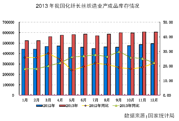 從2012年開(kāi)始攀升的產(chǎn)成品庫(kù)存仍在持續(xù)增長(zhǎng),據(jù)國(guó)家統(tǒng)計(jì)局統(tǒng)計(jì),截至2013年年底,我國(guó)化纖長(zhǎng)絲織造業(yè)產(chǎn)成品庫(kù)存達(dá)到60.56億元,同比增長(zhǎng)22.22%。從全年來(lái)看,盡管企業(yè)始終努力從調(diào)節(jié)生產(chǎn)、調(diào)整產(chǎn)品結(jié)構(gòu)、甚至降低產(chǎn)品價(jià)格等多方面消化庫(kù)存,但眾所周知,只要持續(xù)生產(chǎn),只要市場(chǎng)沒(méi)有徹底轉(zhuǎn)好,庫(kù)存實(shí)際上是一邊消化、一邊積壓。