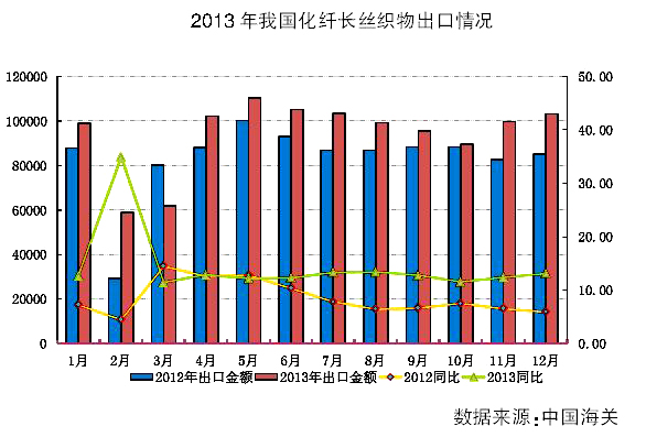 2013年,我國(guó)紡織織物累計(jì)出口358.67億美元,同比增長(zhǎng)14.63%;其中化纖長(zhǎng)絲織物累計(jì)出口112.74億美元,同比增長(zhǎng)13.15%。從全年單月出口情況來(lái)看,化纖長(zhǎng)絲織物一季度出口并不穩(wěn)定,5月份單月出口額達(dá)到全年最高值后一路下滑,到10月跌入谷底,但11月、12月卻又明顯增長(zhǎng),從而保持了全年的增速。從增長(zhǎng)速度看,從2012年3月開(kāi)始下滑,到2013年開(kāi)始緩慢而平穩(wěn)地爬升,這都表明了國(guó)際市場(chǎng)正在逐步改善。