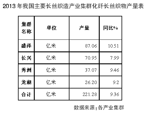 據(jù)各產(chǎn)業(yè)集群地區(qū)統(tǒng)計(jì),2013年盛澤、長(zhǎng)興、秀洲、龍湖四地合計(jì)累計(jì)生產(chǎn)化纖長(zhǎng)絲織物221.28億米,同比增長(zhǎng)9.36%。與2012年相比,各主要產(chǎn)業(yè)集群的生產(chǎn)保持了小幅增長(zhǎng)。