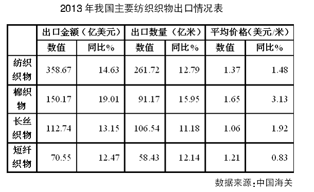 2013年,我國(guó)化纖長(zhǎng)絲織物出口的平均價(jià)格為1.06美元/米,同比僅增長(zhǎng)了1.92%。這有兩方面的原因,一是隨著棉織物出口市場(chǎng)的恢復(fù),國(guó)際市場(chǎng)減少了對(duì)高檔化纖長(zhǎng)絲織物的需求;另一方面則是國(guó)際市場(chǎng)中中低端市場(chǎng)的需求擴(kuò)大,加大了對(duì)低檔化纖長(zhǎng)絲織物的需求量。但是,出口價(jià)格的低速增長(zhǎng),難以應(yīng)對(duì)人民幣快速升值帶來(lái)的損失,如果分別按當(dāng)期匯率折算成人民幣,出口價(jià)格實(shí)際上是從年初的6.54元/米下降到年末的6.48元/米,直接損失6.39億元。