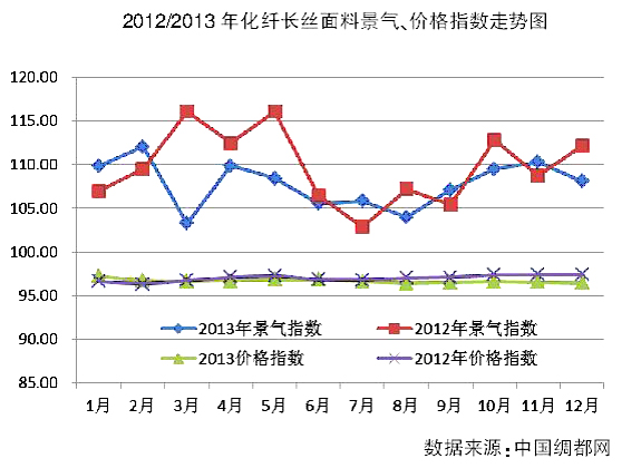 2013年化纖長(zhǎng)絲織物內(nèi)銷(xiāo)價(jià)格持續(xù)了2012年的平穩(wěn)低迷,并在下半年進(jìn)一步下滑,但幅度不大。2013年市場(chǎng)信心比2012年略為穩(wěn)定,并在下半年8~11月保持了明顯的上揚(yáng),12月回落。