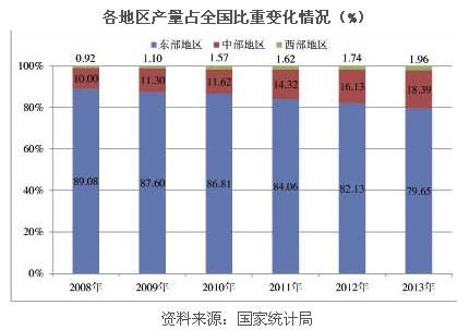 近年來,我國加快推進自貿區(qū)建設,大力開拓新興市場,服裝出口對發(fā)達市場的依賴程度降低。2013年,我國對亞洲服裝出口份額連續(xù)上升,對歐洲服裝出口份額恢復小幅微增,對其他大洲的出口份額均呈現(xiàn)不同幅度的下降。 據(jù)海關總署數(shù)據(jù),2013年,我國對歐盟、美國、日本、香港地區(qū)4個傳統(tǒng)市場的出口金額總計為1039.46億美元,同比增長7.85%,占全國服裝出口總額的58.32%,份額減少1.86個百分點;出口數(shù)量為171.77億件,同比增長6.46%,占全國服裝出口總量的54.77%,份額減少1.03個百分點。而對新興市場出口服裝金額和數(shù)量的比重,則分別較2012年同期增加2.59和2.79個百分點。 隨著我國西部大開發(fā)、中部崛起、振興東北老工業(yè)基地等區(qū)域發(fā)展戰(zhàn)略的相繼實施,我國服裝出口的地區(qū)布局進一步優(yōu)化。東部省市服裝出口占全國比重持續(xù)下降,中西部地區(qū)服裝出口活躍。從各省市出口情況來看,2013年,我國服裝出口仍集中于東部沿海地區(qū),但份額繼續(xù)下降。 根據(jù)中國海關統(tǒng)計,2013年,我國東部地區(qū)服裝及衣著附件出口金額1454.28億美元,占全國服裝及衣著附件出口總額的81.6%,比重較2012年減少2.26個百分點。中西部地區(qū)服裝及衣著附件出口327.94億美元,占全國服裝及衣著附件出口總額的18.4%,比重較2012年增加2.26個百分點。