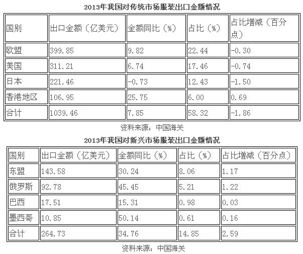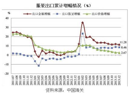 外銷市場 需求部分恢復總體仍顯疲弱 經濟溫和復蘇促使市場需求部分恢復,2013年,我國服裝出口金額和出口數(shù)量增速較2012年均有較大幅度提高。同時,對發(fā)達市場出口依賴程度降低,出口地區(qū)布局更趨多元,出口單價持續(xù)提升等特征進一步凸顯。 據(jù)中國海關統(tǒng)計,2013年,我國累計完成服裝及衣著附件出口1782.24億美元,同比增長11.28%,增幅較2012年同期提升6.75個百分點。服裝出口數(shù)量為313.59億件,同比增長8.46%,增幅較2012年同期提升9.53個百分點。