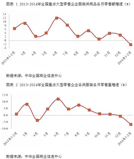 根據(jù)中華全國商業(yè)信息中心的統(tǒng)計(jì),2014年1-2月份,全國重點(diǎn)大型零售企業(yè)服裝零售額同比下降2.2%,各類服裝零售量同比下降6.7%,服裝零售價(jià)格相比上年同期上漲4.7%。