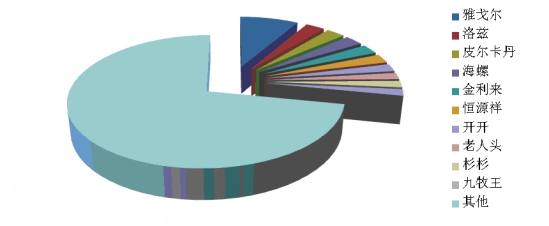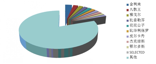 8、羊毛衫:前十位品牌市場綜合占有率合計(jì)為28.6%