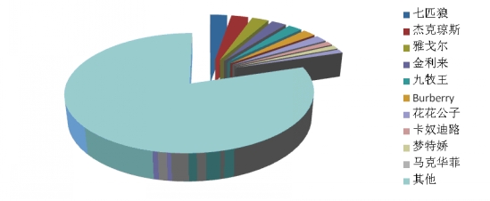 根據(jù)中華全國商業(yè)信息中心的統(tǒng)計(jì),2014年1月份全國重點(diǎn)大型零售企業(yè)褲子銷售前十位品牌市場綜合占有率合計(jì)為28.3%,九牧王繼續(xù)以較明顯的優(yōu)勢占據(jù)榜首,虎都和邁雅分列第二和第三位。