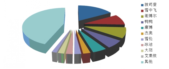 根據(jù)中華全國商業(yè)信息中心的統(tǒng)計(jì),2014年1月,全國重點(diǎn)大型零售企業(yè)羽絨服銷售前十位品牌市場綜合占有率合計(jì)為55.9%,波司登、雪中飛和坦博爾占據(jù)前三位。