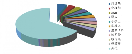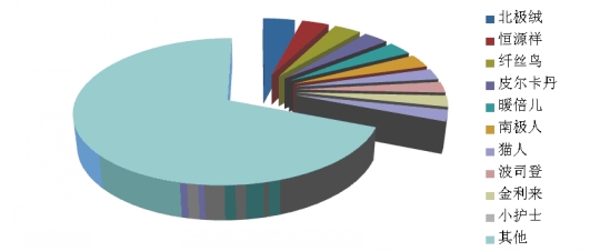 根據(jù)中華全國商業(yè)信息中心的統(tǒng)計(jì),2014年1月,全國重點(diǎn)大型零售企業(yè)保暖內(nèi)衣銷售前十位品牌市場綜合占有率合計(jì)為34.7%,纖絲鳥、北極絨和A&B占據(jù)前三位。
