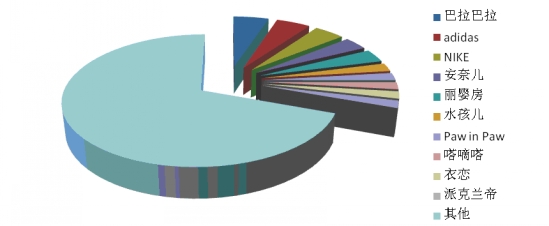 根據(jù)中華全國商業(yè)信息中心的統(tǒng)計(jì),2014年2月份全國重點(diǎn)大型零售企業(yè)童裝銷售前十位品牌市場綜合占有率合計(jì)為32.8%,前三位依次是巴拉巴拉、adidas和NIKE。
