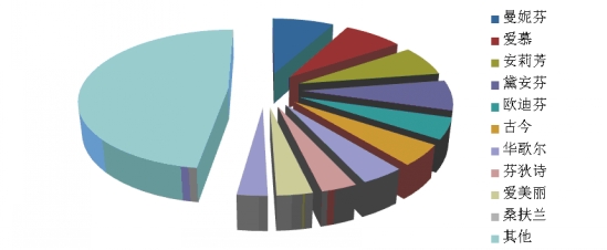 根據(jù)中華全國商業(yè)信息中心的統(tǒng)計(jì),2014年2月,全國重點(diǎn)大型零售企業(yè)女性內(nèi)衣銷售前十位品牌市場綜合占有率合計(jì)為52.3%,曼妮芬、愛慕和安莉芳占據(jù)前三位。