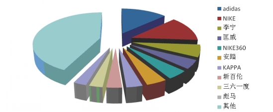 根據(jù)中華全國商業(yè)信息中心的統(tǒng)計(jì),2014年2月,全國重點(diǎn)大型零售企業(yè)運(yùn)動服銷售前十位品牌市場綜合占有率合計(jì)為57.1%,其中,adidas、NIKE和李寧占據(jù)前三位。