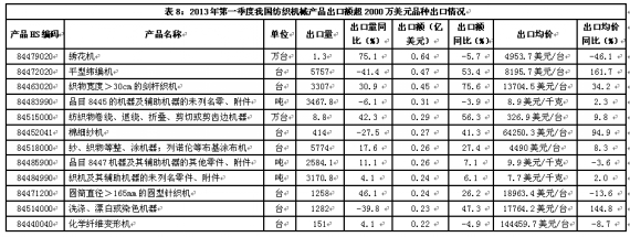 紡織機械產品 出口快速增長 今年第一季度,我國紡織機械產品共出口6.6億美元,同比增長21.5%。其中,對印度出口1.1億美元,增長8.7%,對越南出口8631萬美元,增長38.5%。對以上兩市場出口額合計占同期紡織機械類產品出口總額的29.1%。出口額超2000萬美元的主要品種出口情況如表8所示。