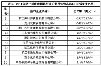 從出口企業(yè)情況來看,我國化纖及工業(yè)用紡織品產品出口集中度較低,出口額排名前10位企業(yè)出口額合計僅占同期出口總額的5%,今年第一季度出口10強企業(yè)名單見如表5。