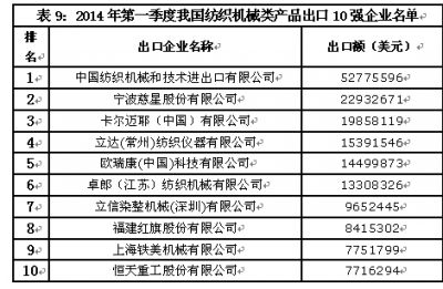從出口企業(yè)情況來看,我國紡織機械類產品出口集中度相對集中,出口額排名前10位企業(yè)出口額合計占同期我國紡織機械類產品出口總額的26.2%。今年第一季度出口10強企業(yè)名單見表9。