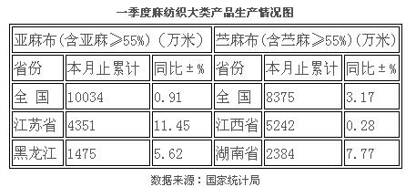 一季度我國麻紡織行業(yè)整體經(jīng)濟形勢良好,特別是含麻服裝,依然保持了高速增長態(tài)勢,麻紡織品進出口出現(xiàn)結(jié)構(gòu)性調(diào)整,從初級產(chǎn)品向終端產(chǎn)品轉(zhuǎn)化。然而在當前情況復雜多變的市場環(huán)境下,中國麻紡行業(yè)在發(fā)展道路上還將面臨諸多困難。 2014年一季度,全國300家規(guī)模以上麻紡織企業(yè)主營業(yè)務收入累計達110.27億元,同比增長6.55%;實現(xiàn)累計利潤總額達5.56億元,同比增長13.06%;存貨累計達52.82億元,同比增長8.01%。其中銷售利潤率為5.04%,比去年同期的4.75%增長了0.29個百分點。 麻紡織主要大類統(tǒng)計產(chǎn)品為亞麻布與苧麻布。據(jù)統(tǒng)計局數(shù)據(jù)顯示,亞麻布與苧麻布生產(chǎn)狀況較去年相比,增速幅度略有提升。其中亞麻布生產(chǎn)方面,根據(jù)統(tǒng)計局跟蹤的59家亞麻企業(yè)生產(chǎn)數(shù)據(jù),2014年一季度59家規(guī)模以上企業(yè)累計生產(chǎn)亞麻布(含亞麻≥55%)達1.01億米,同比增加0.91%,與去年同期相比增長幅度上升;其中江蘇依然是亞麻布(含亞麻≥55%)生產(chǎn)量最大省份,累計生產(chǎn)4351萬米,占全國亞麻布生產(chǎn)比重約43.36%,并且增速同比增加11.45%,大于國內(nèi)0.91%的增長速度,后期所占比重依然會有小幅提升。在苧麻布生產(chǎn)方面,跟蹤的38家規(guī)模以上企業(yè)累計生產(chǎn)苧麻布(含苧麻≥55%)達8375萬米,同比增長3.17%,與去同期相比增加了13個百分點。