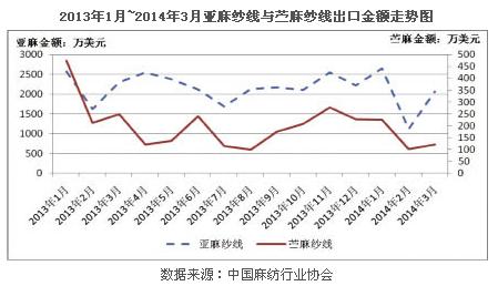 今年一季度,紡織工業(yè)完成投資807.71億元,同比增長16.42%,其中,麻紡織行業(yè)累計完成投資18.08億元,同比增長15.36%。與此同時,麻紡織企業(yè)新開工項目數(shù)量與施工項目數(shù)量較去年同期分別下降7.32%與25%,并且增速下降幅度較整個紡織行業(yè)相比稍大。 進出口市場穩(wěn)中有進 2014年一季度,全國麻紡織行業(yè)進出口累計總額達5.38億美元,比去年的4.99億美元同比增長7.63%。 進口總體情況良好,原料價格上升幅度較大。2014年一季度,全國麻紡織行業(yè)累計進口總額達1.93億美元,同比增長22.89%;其中麻原料累計進口金額達1.46億美元,同比增長25.33%;麻紗線累計進口金額達2589.22萬美元,同比增長39.59%;麻織物累計進口金額達1899.90萬美元,同比增長1.92%;麻制品累計進口金額達177.12萬美元,同比下降42.73%。 麻原料為主要進口力量,而亞麻原料與黃麻原料為主要進口金額拉動力量。其中亞麻原料累計進口金額達9258.21萬美元,同比增長36.44%;黃麻原料累計進口金額達561.29萬美元,同比下降38.46%。 縱觀2013年直至現(xiàn)在的亞麻原料進口情況,亞麻原料進口情況波動較大,上半年亞麻市場需求會增多,但下半年亞麻市場需求會減弱,企業(yè)需要根據(jù)市場形勢,及時調(diào)節(jié)企業(yè)運行情況。