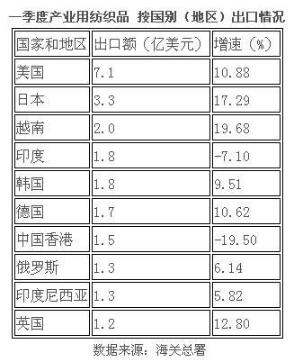 分國別或地區(qū)看,美國是我國產(chǎn)業(yè)用紡織品最大的出口國,占出口總額的15.6%,一季度出口額達到7.1億美元,增長10.88%。對日本、越南、德國和英國的出口都保持了超過10%以上的增速,對韓國、俄羅斯和印度尼西亞的出口增速在10%以內(nèi),對印度的出口下降了7.1%,而對中國香港的出口降幅最高,達到19.5%。對上述10大市場的出口額占全部出口額的50.5%,出口市場總體上比較分散,有利于化解市場風(fēng)險。