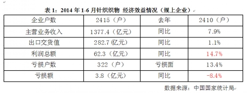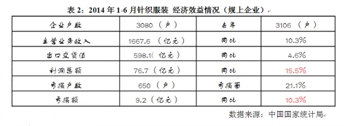 表2:2014年1~6月針織服裝經(jīng)濟(jì)效益情況(規(guī)模以上企業(yè))