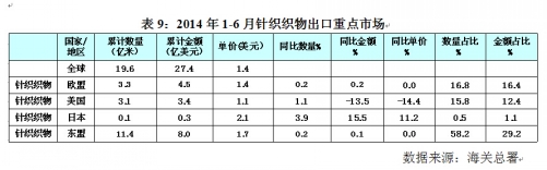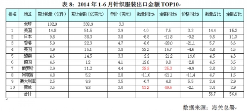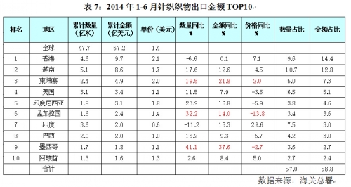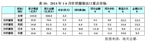 進(jìn)出口競爭力上升 從針織織物與針織服裝的兩板塊進(jìn)出口數(shù)據(jù)綜合分析,可以看到針織織物板塊競爭力上升,出口數(shù)量小幅增長,進(jìn)口的依賴度下降,進(jìn)口以高檔面料為主。針織服裝板塊出口下降,進(jìn)口增加,歐美日重點(diǎn)出口市場均沒有明顯增長,對東盟出口增幅下降。 出口情況 整體情況 如表6所示,從海關(guān)總署出口匯總數(shù)字來看,針織織物板塊單價略有增長,主要由數(shù)量增長帶動了金額的增長,但數(shù)量增長的9.9%較上季度有所回落,較2013年度14.1%有所減少。 而針織服板塊裝則不同,針織服裝出口數(shù)量變化不大,由于單價的同比下降,造成了累計(jì)金額同比下降。2013年全年針織服裝的平均單價為3.7美元,本季度為3.3美元,與上季度相同。 表6:2014年1~6月針織行業(yè)出口情況
