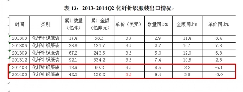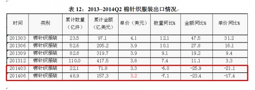 原料對針織服裝影響顯著 從以下4張圖表(圖1、圖2、表12、表13)可以看出,受原料價格的影響,棉制針織服裝出口在近一年半內(nèi)量價齊跌,而化纖類針織服裝出口價格下降,數(shù)量不斷上升,最終兩者在本季度單價相同,均為3.2美元,化纖的替代作用表現(xiàn)明顯。