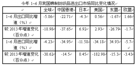分析:總體來看,我國(guó)棉制紡織品在今年1~6月的進(jìn)出口貿(mào)易中呈現(xiàn)下滑趨勢(shì)。與2013年相比,棉制紡織品出口增速下降了約19個(gè)百分點(diǎn),進(jìn)口下降了28個(gè)百分點(diǎn),主要受市場(chǎng)需求低迷特別是終端需求減弱的影響較大。 數(shù)字:從我國(guó)棉制紡織品出口市場(chǎng)看,今年1~6月我國(guó)出口中國(guó)香港相對(duì)低迷,較2013年下降了37.65個(gè)百分點(diǎn);對(duì)日本、東盟同比減少,對(duì)美國(guó)同比基本持平;對(duì)歐盟同比微增。 從進(jìn)口市場(chǎng)看,今年1~6月我國(guó)自中國(guó)香港、美國(guó)、東盟、歐盟進(jìn)口均有不同程度下降,自日本市場(chǎng)進(jìn)口小幅上升。