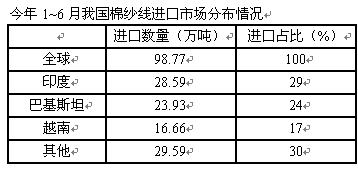 分析:我國(guó)棉花政策的調(diào)整是影響進(jìn)口紗貿(mào)易的一個(gè)重要因素。由于新年度取消了棉花收儲(chǔ)政策改為直補(bǔ),國(guó)內(nèi)棉花價(jià)格下跌預(yù)期明確。受國(guó)內(nèi)棉價(jià)下行影響,國(guó)內(nèi)外棉價(jià)差總體縮窄,國(guó)內(nèi)紗價(jià)隨之下跌,使進(jìn)口紗承壓,國(guó)內(nèi)企業(yè)對(duì)進(jìn)口棉紗線的熱度有所減弱。 數(shù)字:今年1~6月我國(guó)累計(jì)出口棉紗線24.1萬(wàn)噸,同比下降9.4%,出口棉紗線量跌價(jià)升。
