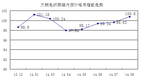 8月大朗女裝和男裝毛織服裝內(nèi)貿(mào)價(jià)格個(gè)別發(fā)展,升跌互見(jiàn),其中:女裝毛織服裝內(nèi)貿(mào)價(jià)格指數(shù)報(bào)100.25,環(huán)比升1.60%,女裝長(zhǎng)袖和短袖開(kāi)胸衫、短袖套頭衫內(nèi)貿(mào)價(jià)格上升,是本月女裝毛織服裝內(nèi)貿(mào)價(jià)格指數(shù)上升的主要原因。男裝毛織服裝內(nèi)貿(mào)價(jià)格指數(shù)報(bào)100.60,環(huán)比跌0.52%,男裝長(zhǎng)袖半開(kāi)胸衫和長(zhǎng)袖開(kāi)胸衫內(nèi)貿(mào)價(jià)格下跌是本月男裝毛織服裝內(nèi)貿(mào)價(jià)格指數(shù)下跌的主要原因。