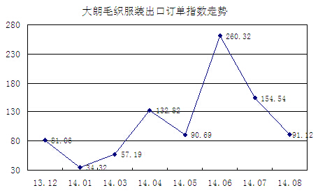 受大朗毛織服裝出口加工生產(chǎn)季節(jié)階段性及人民幣匯率波動(dòng)的影響,加上國(guó)際市場(chǎng)需求增長(zhǎng)疲軟,8月大朗毛織服裝出口加工企業(yè)接受訂單繼續(xù)減少,8月大朗毛織服裝出口訂單指數(shù)報(bào)91.12,比7月跌41.04%。大朗大朗毛織服裝出口加工訂單已經(jīng)是連續(xù)2個(gè)月減少,除了加工生產(chǎn)季節(jié)性因素外,國(guó)際市場(chǎng)總體需求不振是主要影響因素。