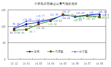 8月大朗毛織服裝企業(yè)景氣指數(shù)報(bào)135.50,其中:出口型企業(yè)景氣指數(shù)報(bào)139.25,內(nèi)貿(mào)型企業(yè)景氣指數(shù)報(bào)128.15,顯示大朗毛織服裝企業(yè)對(duì)短期經(jīng)營(yíng)景氣仍然審慎看好,但是市場(chǎng)需求疲軟、匯率波動(dòng)加大、加工成本上升等仍然是困擾企業(yè)的隱憂(yōu)?!?/p>